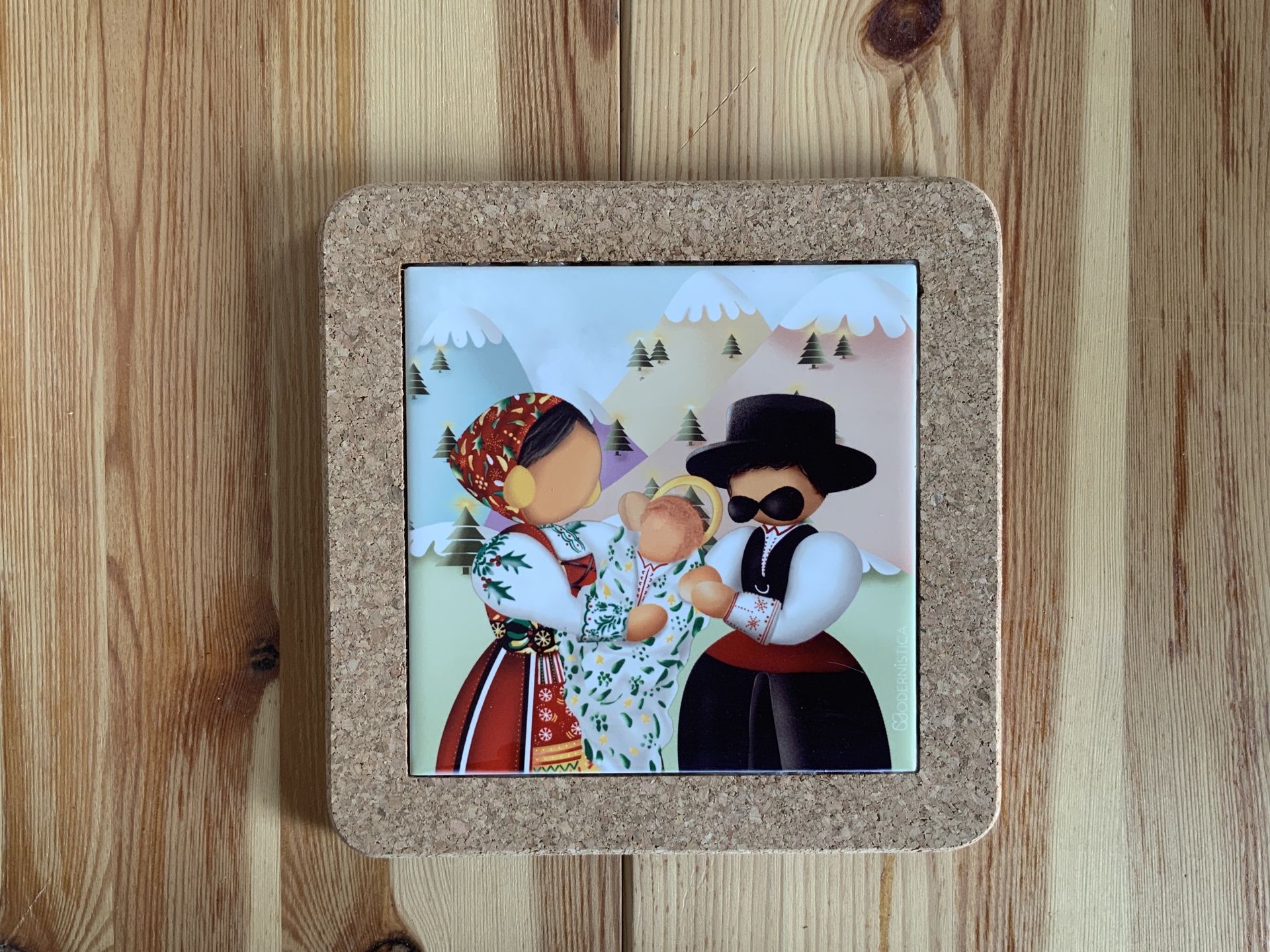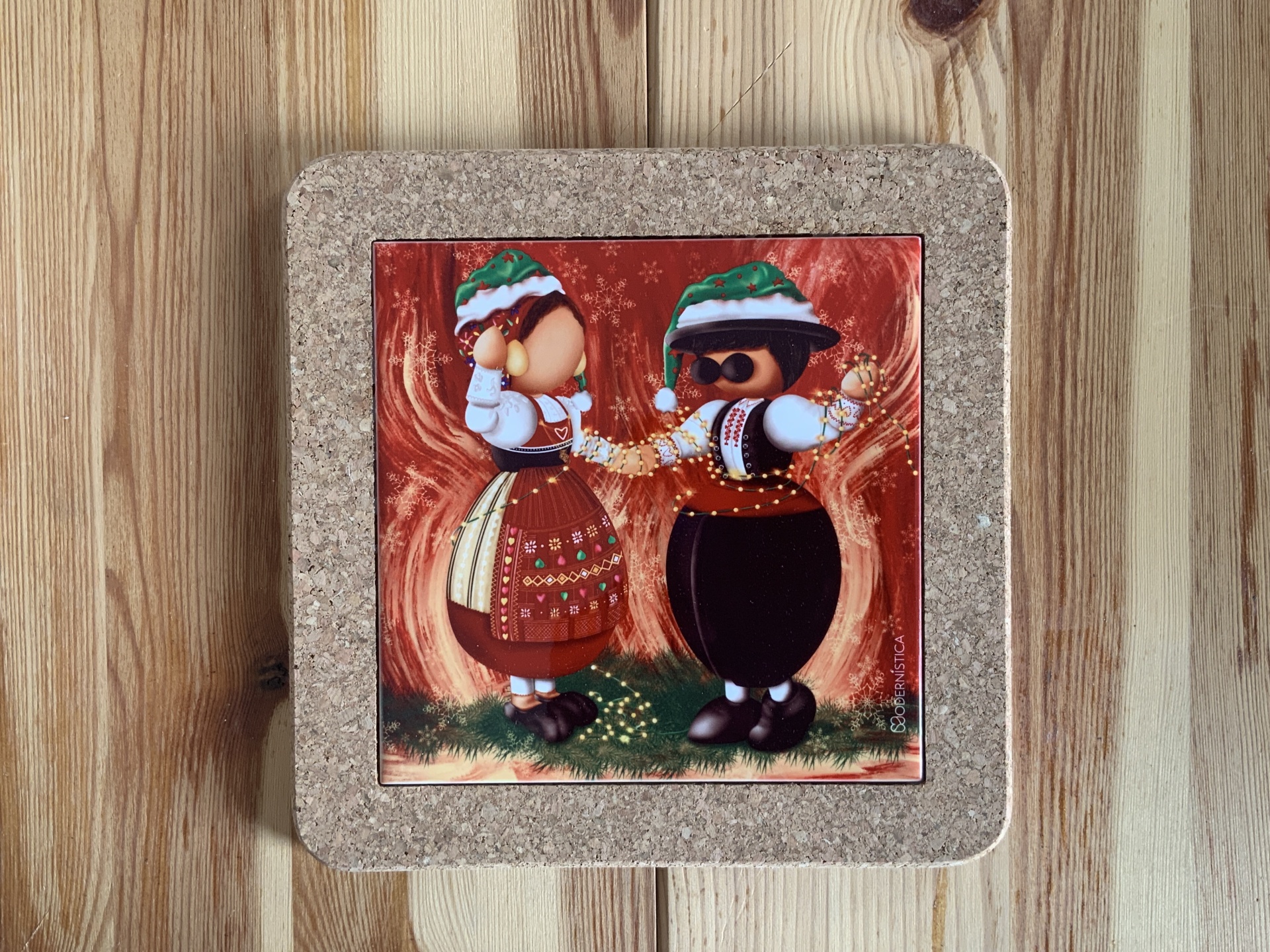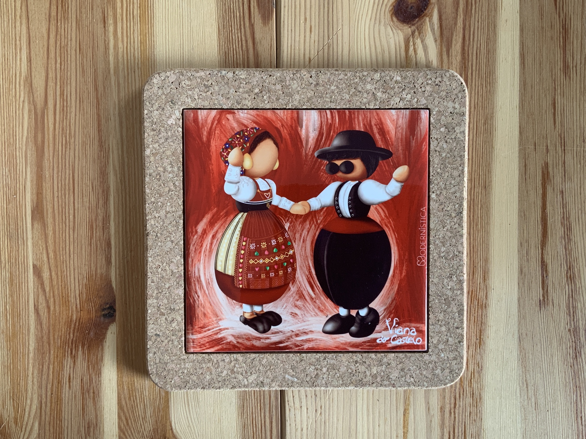 • Azulejo decorativo quadrado com desenho de bonecos a dançar em roupas tradicionais, com moldura de cortiça.