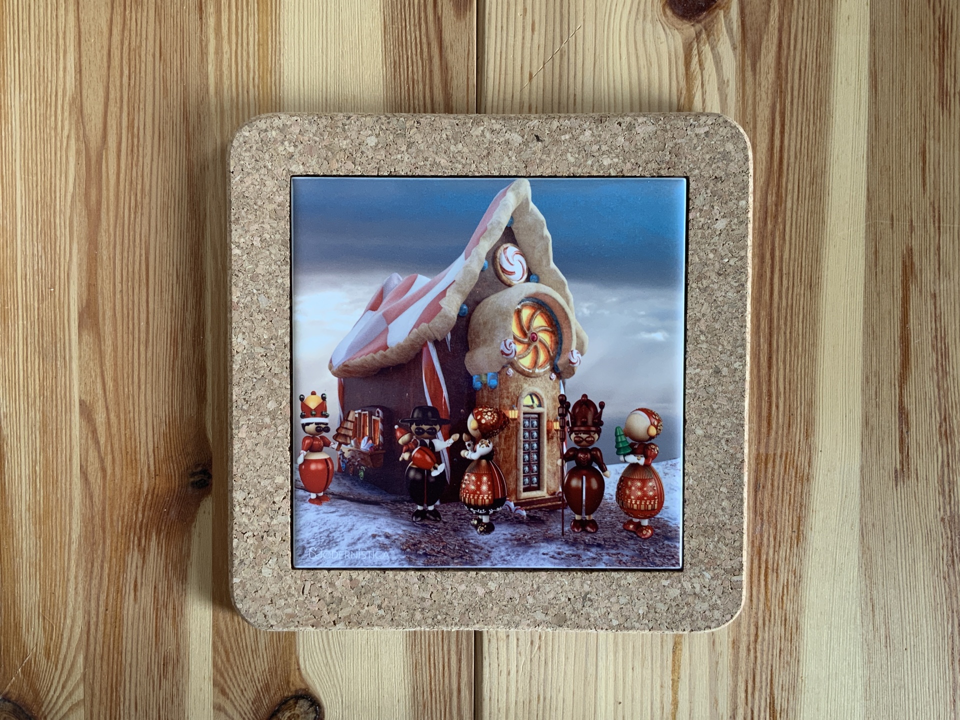 • Caixa quadrada decorada com imagem de casinha de gengibre e figuras decorativas sobre fundo de madeira.