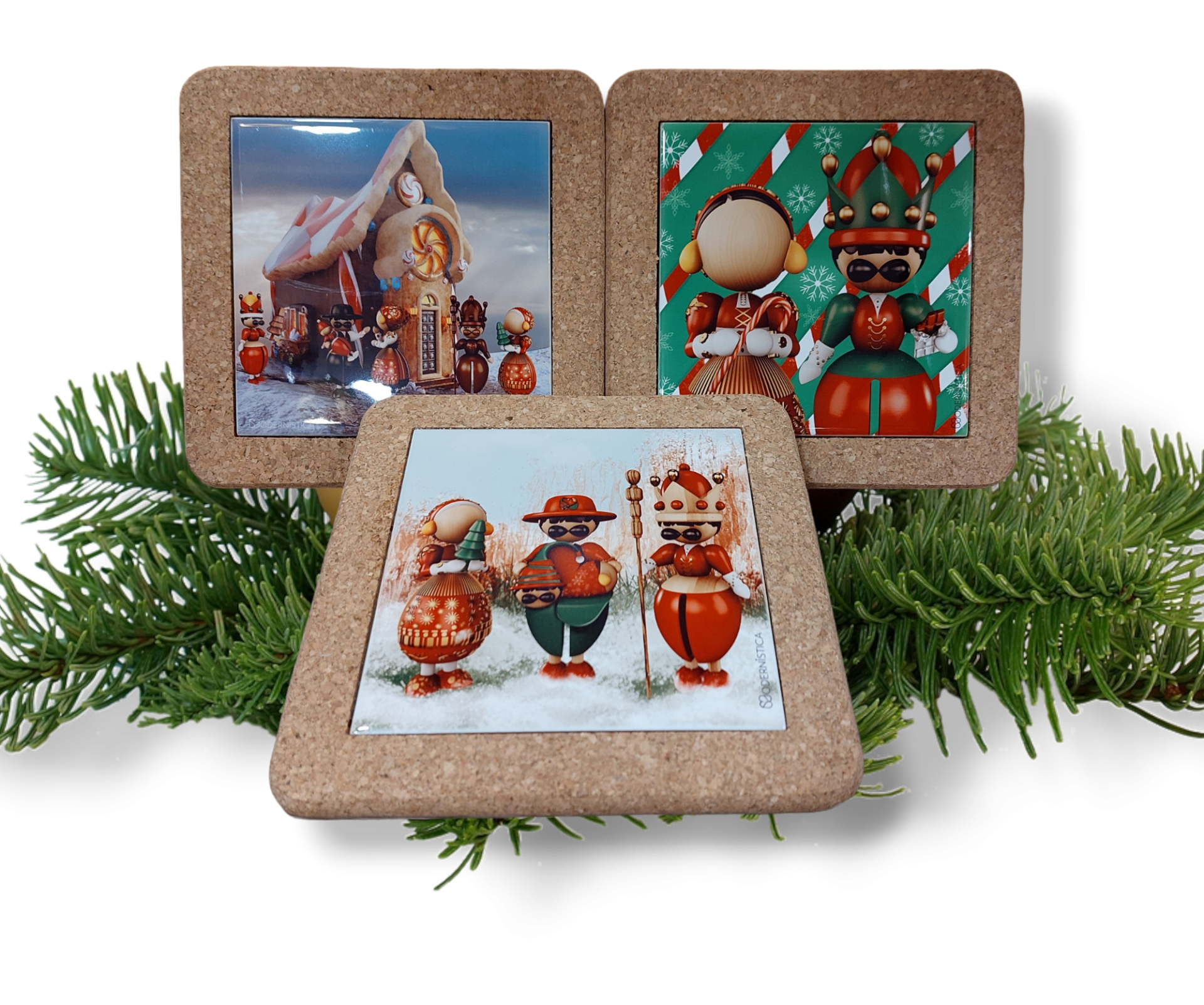 Bases de cortiça com imagens natalícias e ramos de pinheiro