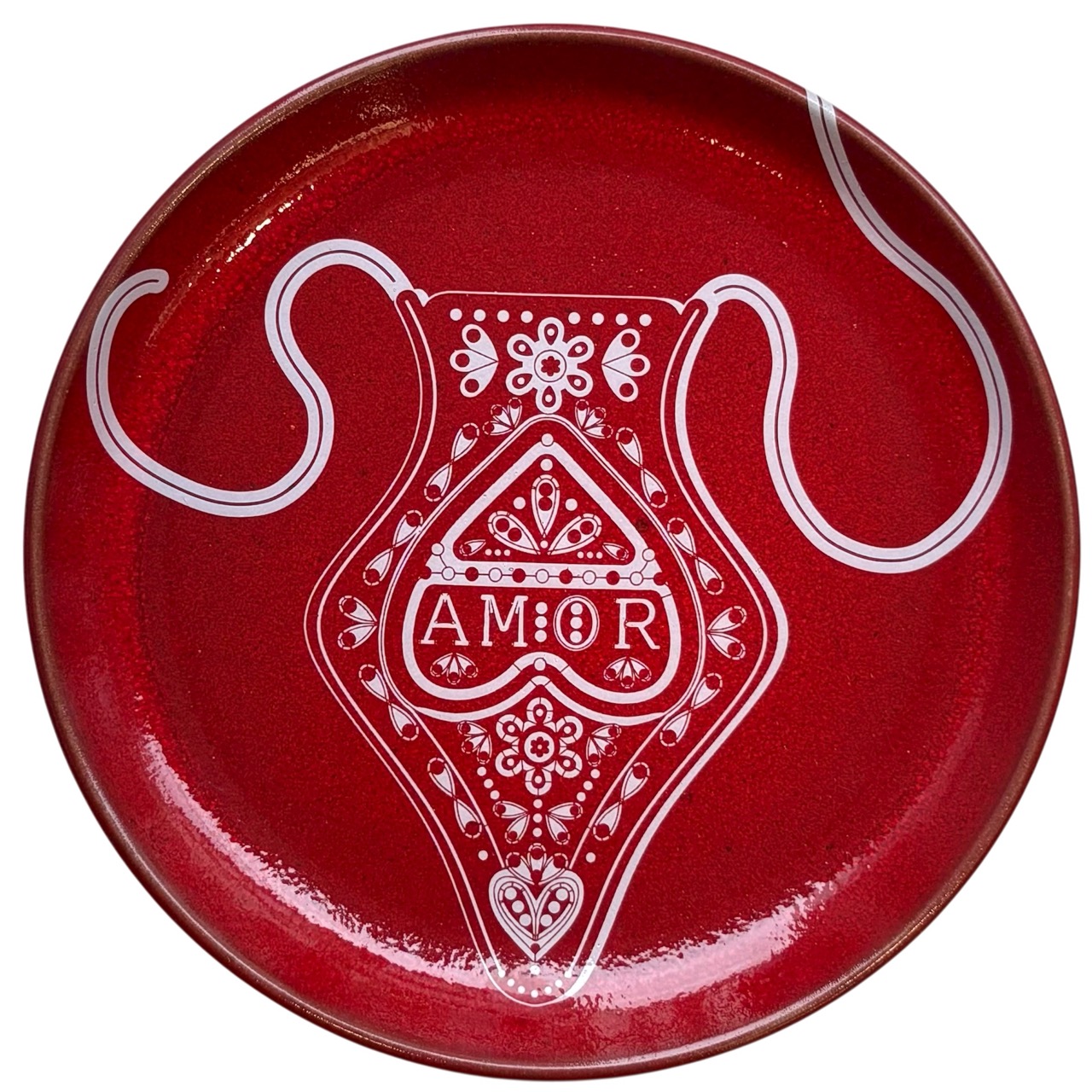 • Prato cerâmico vermelho decorado com jarro branco e palavra AMOR