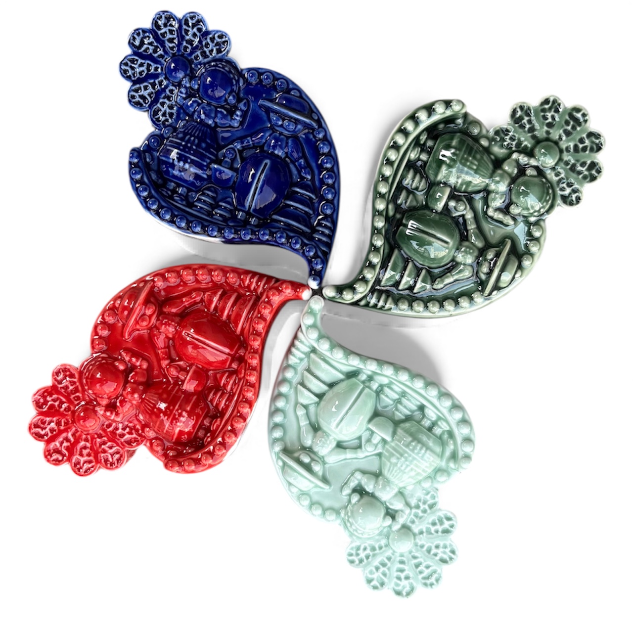 • Quatro pratos cerâmicos em forma de coração nas cores azul, verde, vermelho e branco com detalhes em relevo.