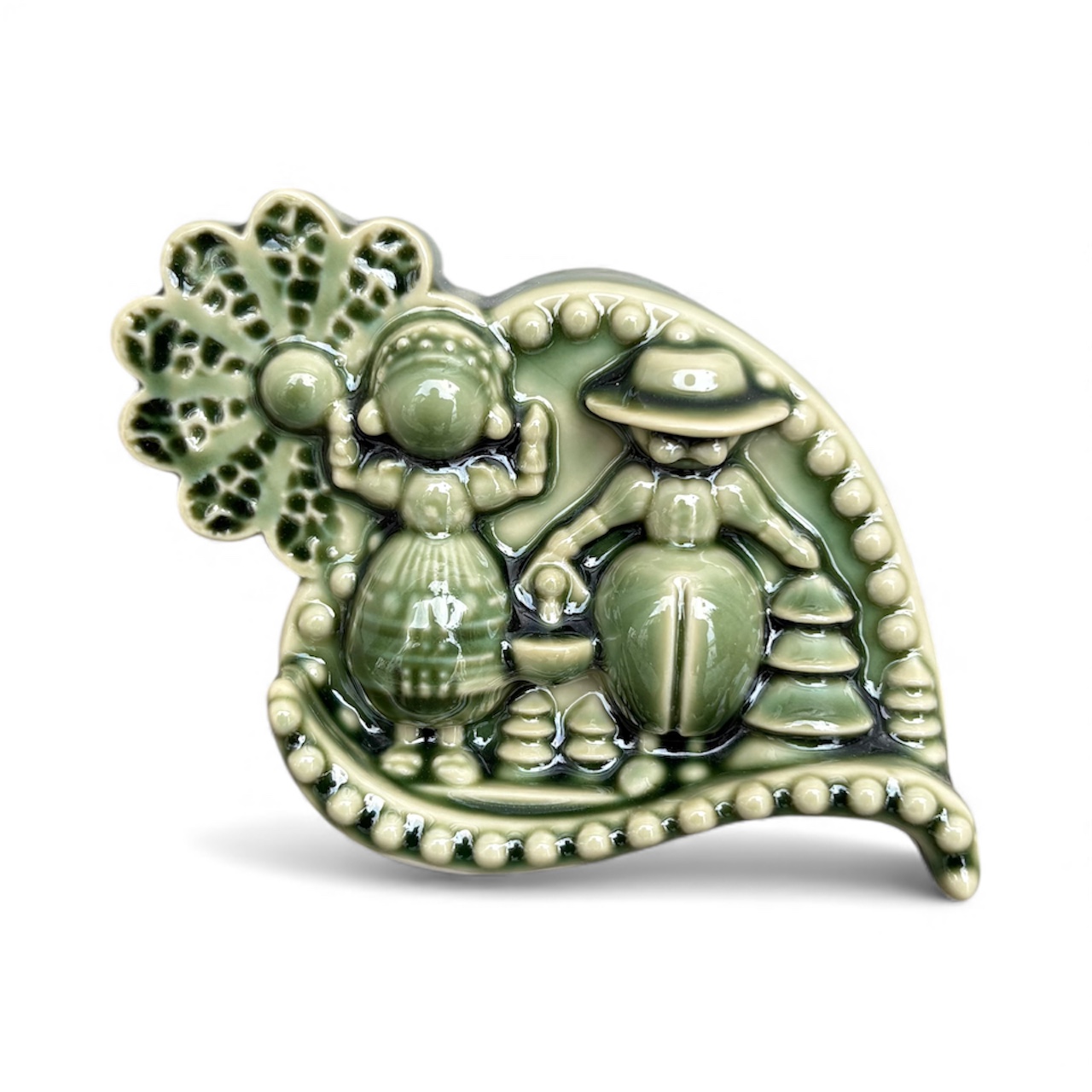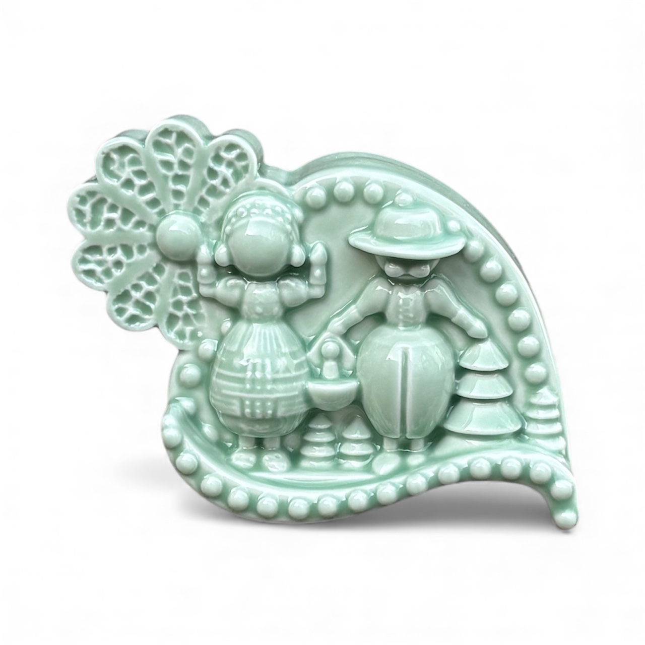 • Peça decorativa em cerâmica vidrada verde com figuras em relevo de duas pessoas numa folha