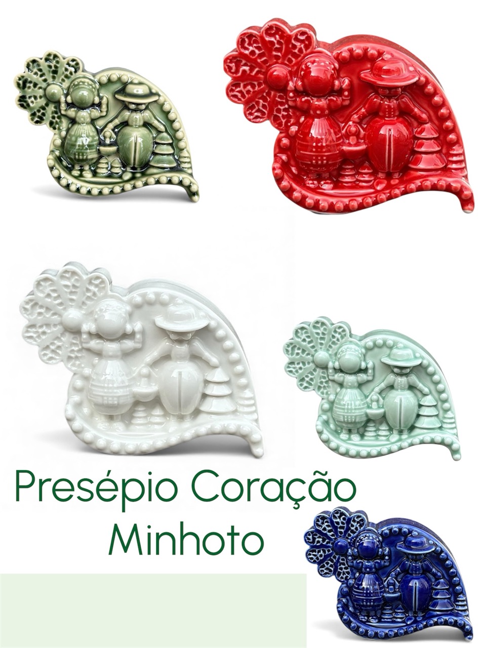 • Presépios em cerâmica coloridos em forma de coração com casal tradicional minhotas e texto