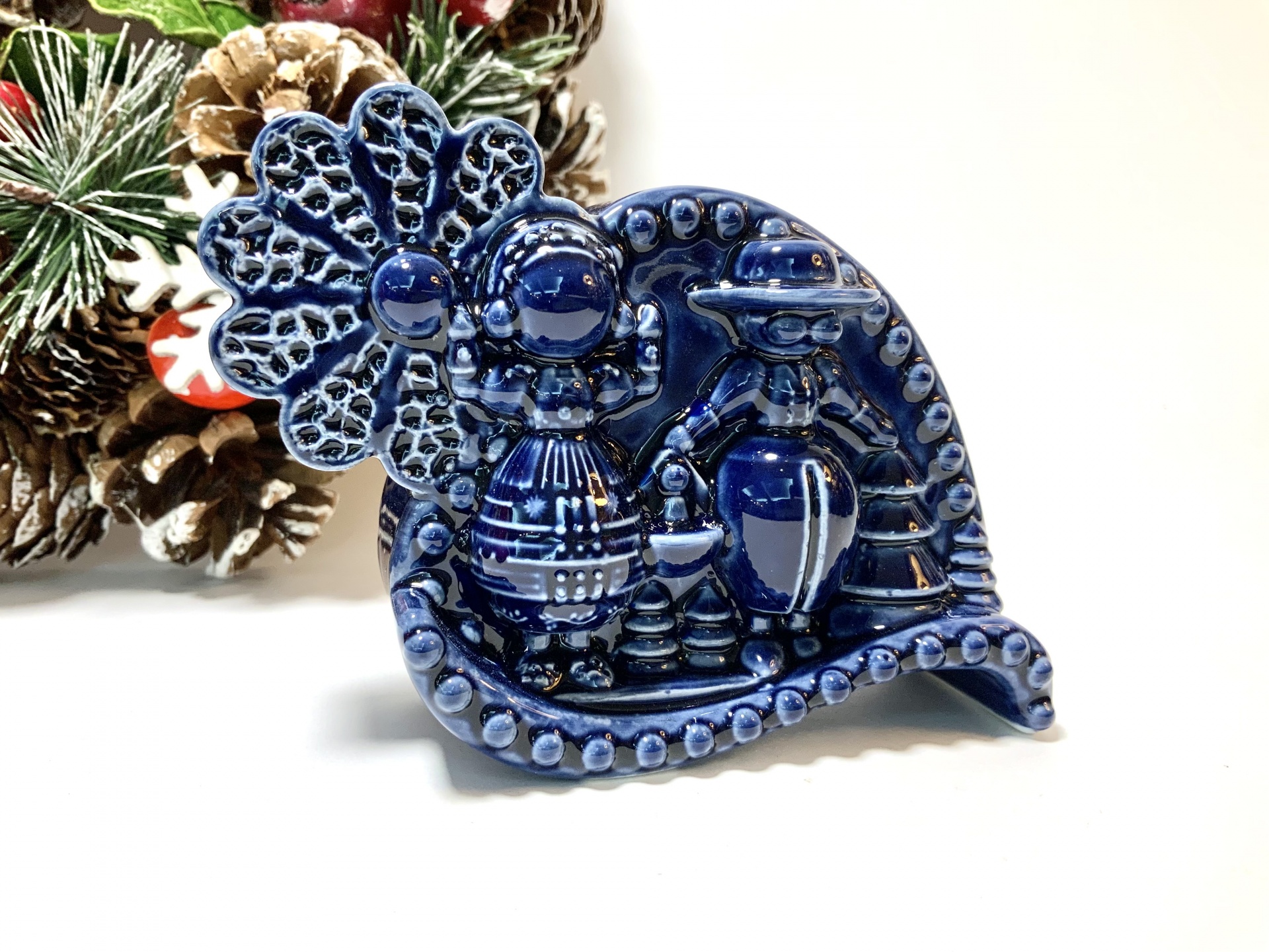 • Figura artesanal azul de cerâmica com relevo e decoração natalícia ao fundo