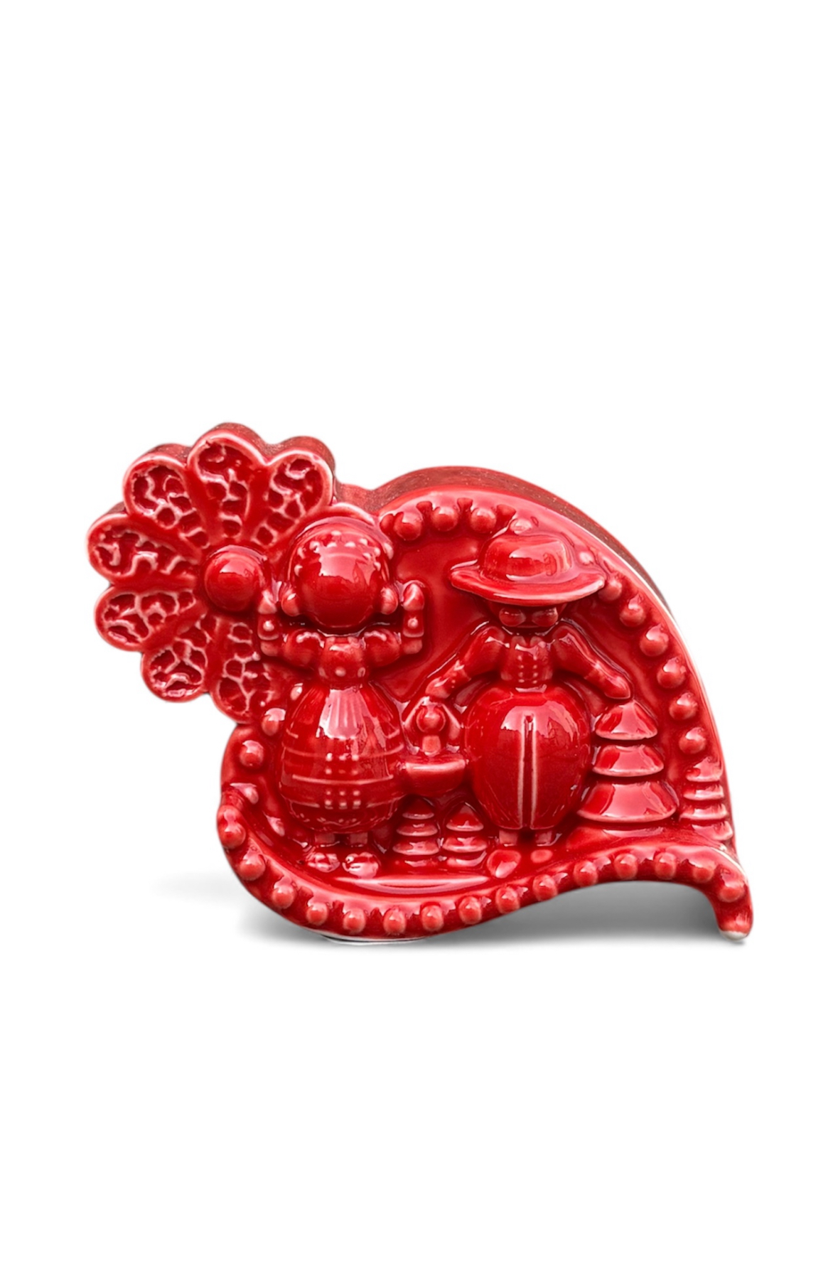 • Figura decorativa vermelha em cerâmica com relevo de duas figuras femininas