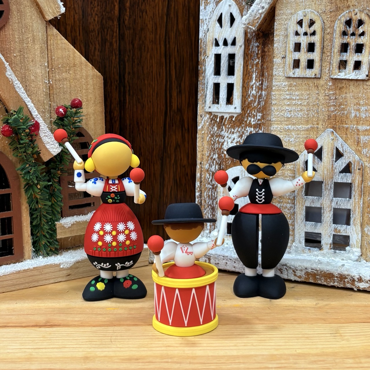 • Três bonecos de madeira com trajes tradicionais e instrumentos musicais em cenário natalício rústico.