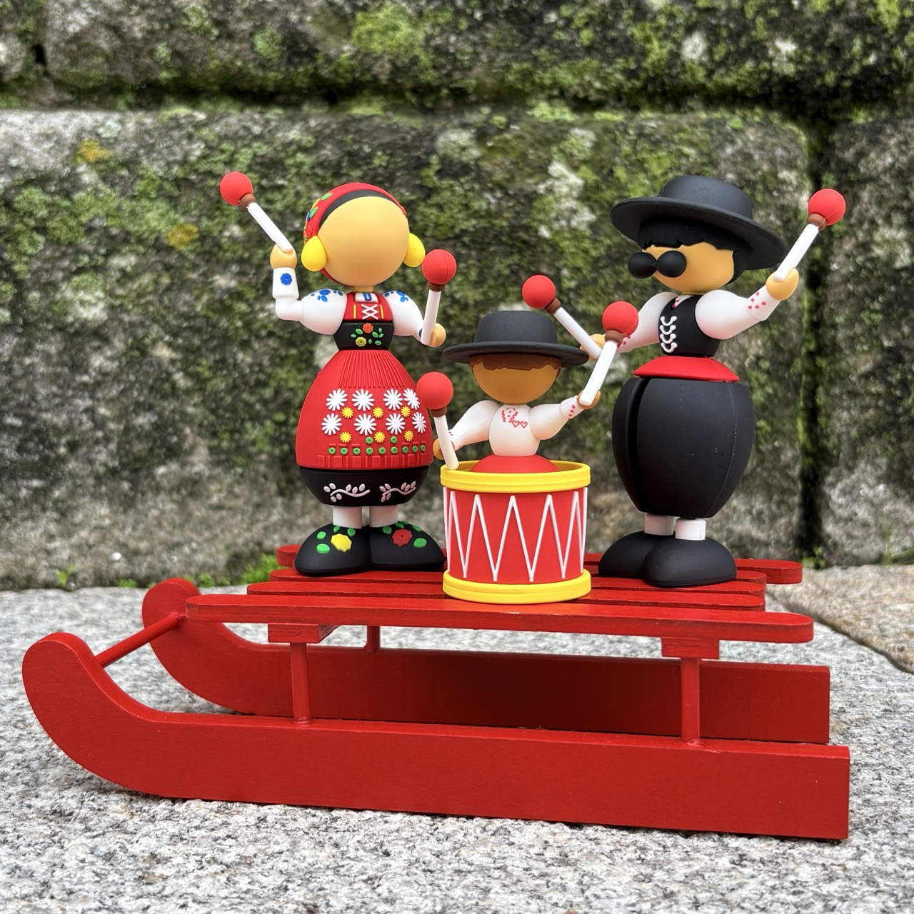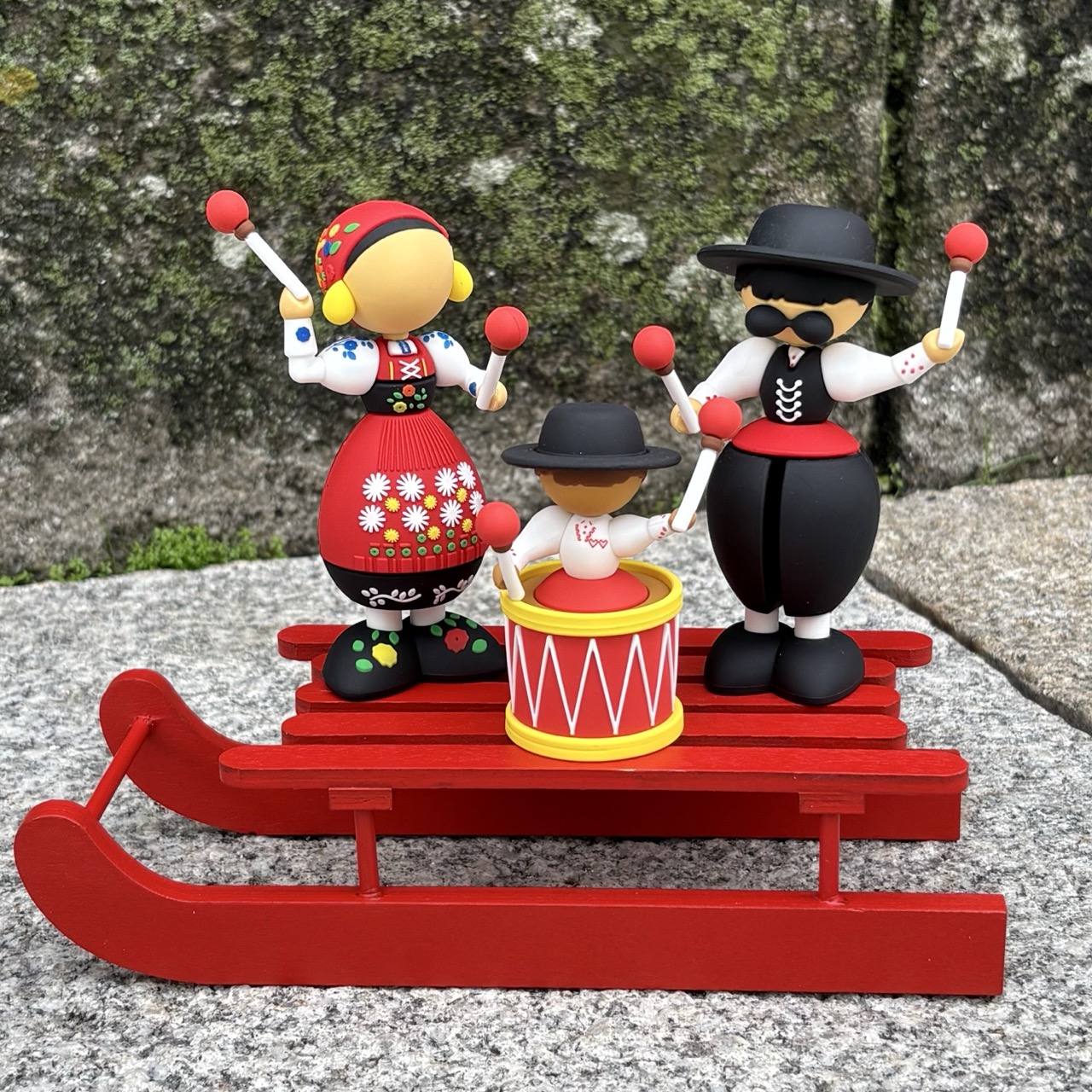 • Três figuras de madeira vestidas a rigor em trajes tradicionais com instrumentos num trenó vermelho.
