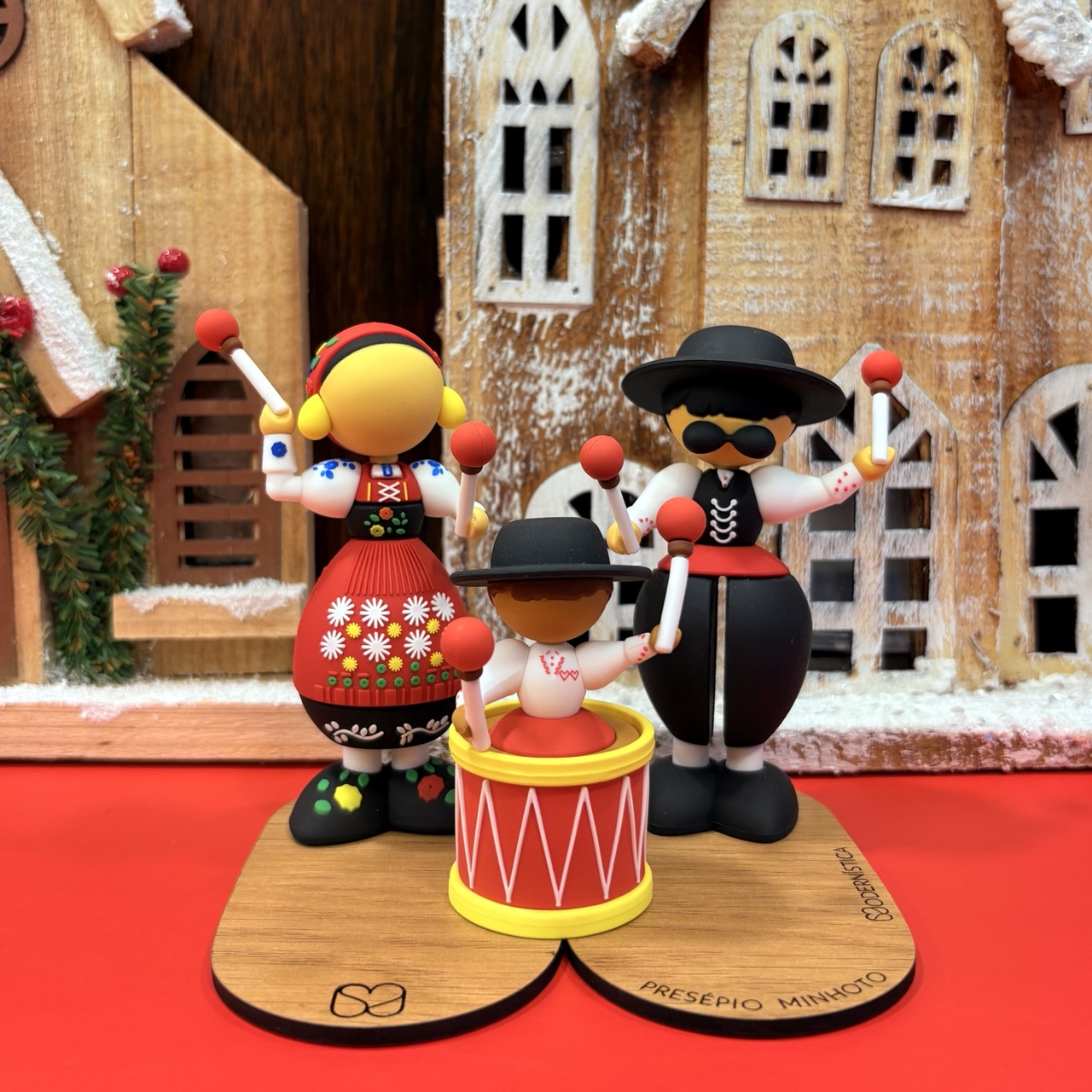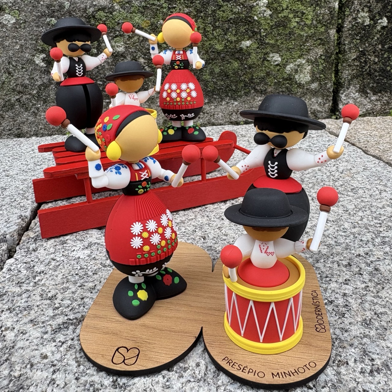 • Figuras decorativas em madeira de dançarinos e músicos em trajes tradicionais minhotos com cores vermelhas, pretas e brancas sobre base de madeira com texto