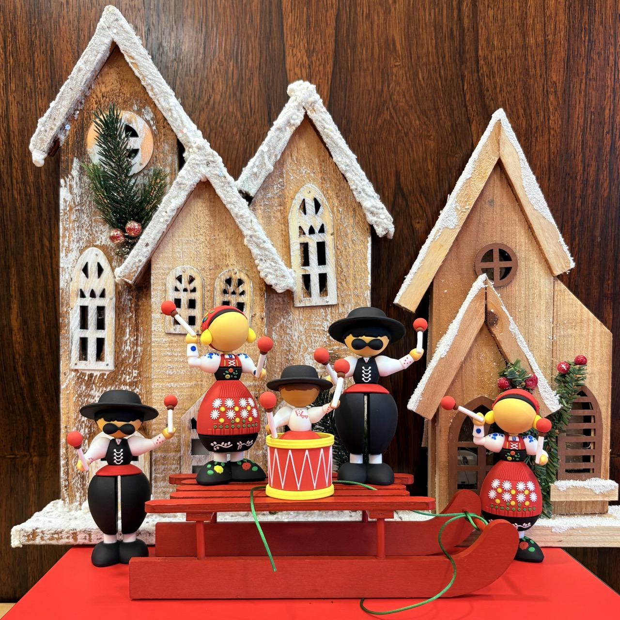 • Figuras de madeira decorativas natalícias com músicos coloridos sobre trenó vermelho, casas de madeira com neve artificial ao fundo.