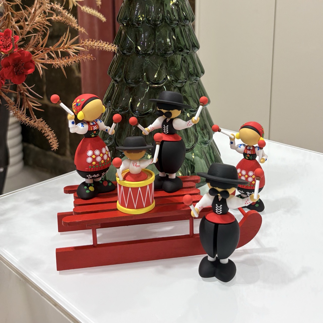 • Bonecos de madeira tradicionais com vestuário colorido e instrumentos num trenó vermelho.