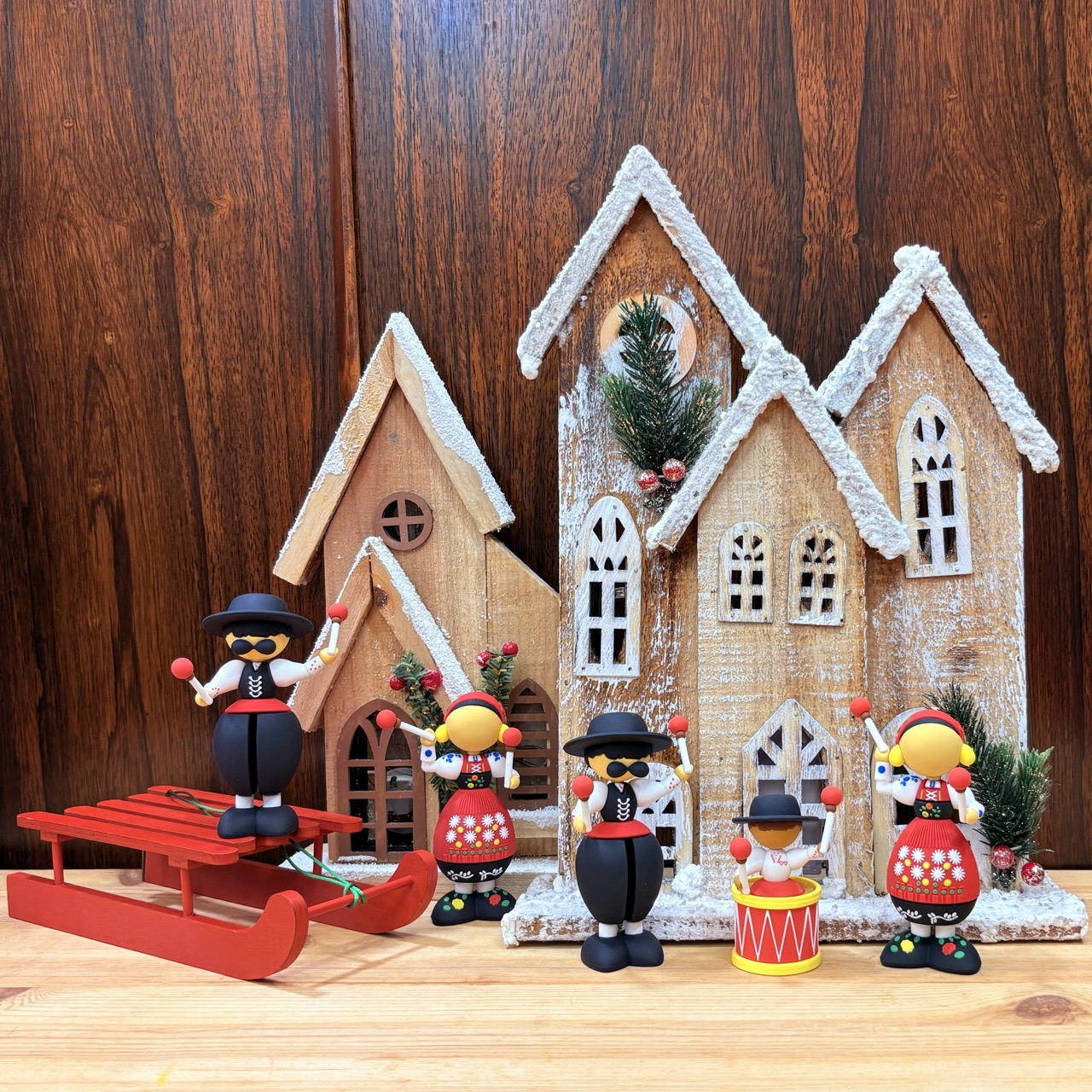 • Decoração de Natal com casinhas de madeira e figuras tradicionais com trens vermelho e pequenos tambores