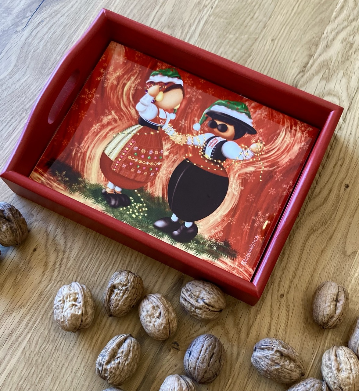 • Tabuleiro de madeira vermelho com cartolina ilustrada com crianças em trajes tradicionais portugueses.